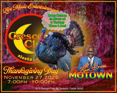 Motown Ross Brown will perform at the Crescent Club Bar & Package - Siesta Key two times in November 2025. The first date, November 21st has been advertised for a week now! The second date is Thanksgiving Day! The time for both shows is 7:00pm -10:00pm. I am looking forward to seeing who is ready to party after eating all that food? Just stay up after the show, because many stores will open for Black Friday, at 11:59pm on Thursday!