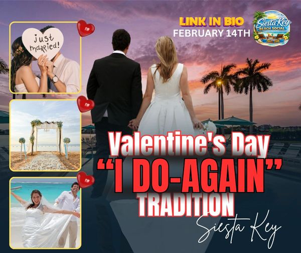 Celebrate love everlasting by saying "I Do – Again" on Siesta Key Beach and Venice Beach. The local, annual Valentine's Day tradition dates back more than 30 years. Every year since 1989, on February 14th, married couples of all ages and duration of matrimony have gathered at Siesta Key Beach for a non-denominational renewal service. The event grew so popular over the years that a second location was added at Venice Beach.